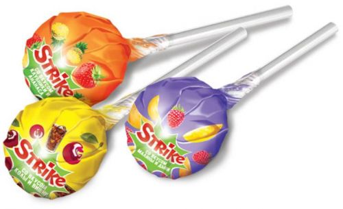 Карамель на палочке со вкусами кисло-сладкого яблока, ароматной клубники, сочного апельсина